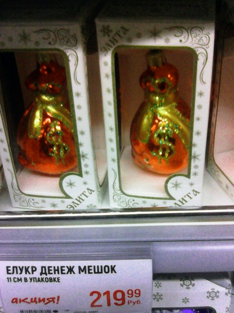 Двадцать шестого числа побывал в таких гигантах торговли, как "Глобус" и "Лента", и душа моя страданиями человеческими уязвлена стала. Предновогодняя гонка начата. Игрушки, гирлянды, К сожалению, был с суровым планшетом, который фотографирует весьма условно, проще зарисовать, но тем не менее... Во-первых: ![]() Каким нужно быть кретином, чтобы повесить на ёлку пластиковый мешок со знаком доллара? Мы что, в Африке живём? Негоdoyou!!!☺ Во-вторых: ![]() Тоже не очень ясно, зачем такое вешать на ёлку. Там было ещё над чем поразмыслить, но встроенная камера не позволила увековечить. Как-нибудь в другой раз. |