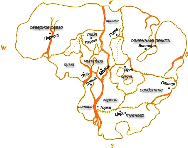 Планета. Собственного названия не имеет, но все заселенные земли имеют название Андария - от двух материков - Андрии и Дарии. В силу особенностей местного солнца и собственного силового поля Андарии климатические особенности там совершенно иные, чем на Земле. Кратко охарактеризовать климат на материке Андрии можно следующим образом. Ледяных шапок на планете нет, однако на северной и южной окраине материка зимой большие морозы (до - 30 по Цельсию), а лето короткое и не очень жаркое. В центральных землях зимы как таковой практически нет, температура падает максимум до -5-7 по Цельсию, но редко. Лето жаркое и по большей части сухое, весна ранняя, а осень долгая. Одна из характерных особенностей Андрии - отсутствие резких перепадов температур и сильных ветров, регулярность и умеренность осадков. Сезонные изменения температур достаточно стабильны. Как показывают наблюдения ведов - климат сглаживается из-за особого поля, окружающего планету. И его нарушение или возмущение вызывает определенные изменения - может случиться ураган, град, заморозки, засуха и пр. ![]() В Андарии 31 государство, которые называются кронии (крония - страна, где правят кроны - короли), сбраны (там правит сбор - некое подобие парламента, состоящее из представителей сословий), лингры (города-государства, в которых процветает свободная торговля. а правит линг - совет самых влиятельных купцов) и несколько свего (правитель - свеган, подобие князя), самым крупным из которых является Северное. Оно находится на границе населенных земель. Однако его северная граница охраняется также хорошо, как и другие - на самом краю Андарии живут полулюди, у которых нет государства, они живут родами, несколько дальше находятся земли отступников, там живут и скрываются преступники и изгнанники, которые сбиваются в банды и часто совершают набеги на Андарию. Кроме того, недалеко край материка, поэтому соседи с востока и запада порой пытаются завоевать этот участок земли, а потом и само княжество, тогда Северное княжество предоставляет защиту полулюдям, а те в свою очередь предупреждают о попытках свержения власти и о других важных событиях, которые видят их жрецы. Также по этому договору при дворе и в главной крепости Северной границы (Цилинне) постоянно живет знахарь из полулюдей, поскольку они сведущи в медицине. Также с севера иногда нападают пираты, впрочем они нападают с любой стороны света. Северная граница считается самой опасной и почетной службой, Смотритель пограничья и его воины являются элитой, поскольку они часто имеют большой опыт и их служба важна. По званию Смотритель уступает только Военному советнику. ![]() Язык в большинстве стран Андрии схож друг с другом, однако различают 5 ветвей. Представители разных ветвей понять друг друга практически не могут. В самых отдаленных и изолированных странах язык настолько отличается, что андарийским его уже не признают. Так, в северном княжестве используют северный язык, который схож с собственно андарийским только некоторыми корнями слов. Классическим считается андарийский центральной части малого материка - Андрии. В частности к этим странам относят Огненные земли. Летосчисление Андрии ведется с разделения материков. Существует легенда, что около семи тысяч лет назад произошла война и небо, осердившись на людей, разделило воюющие земли 
